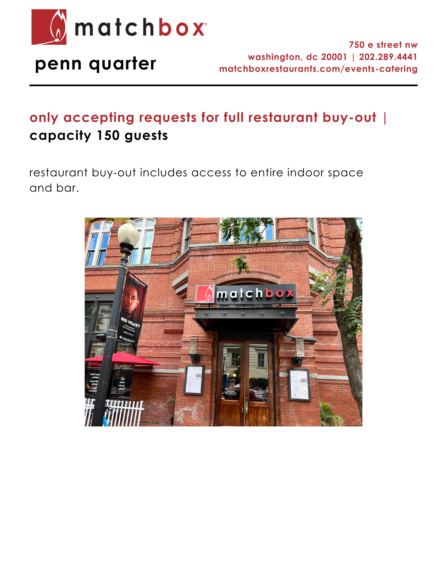 From its prime perch on bustling E Street NW in Penn Quarter, matchbox delights neighborhood workers, visitors, and residents with a casual, welcoming spot for a quick weekday lunch, lively happy hour, bottomless weekend brunch, and dinner for both date nights and groups.